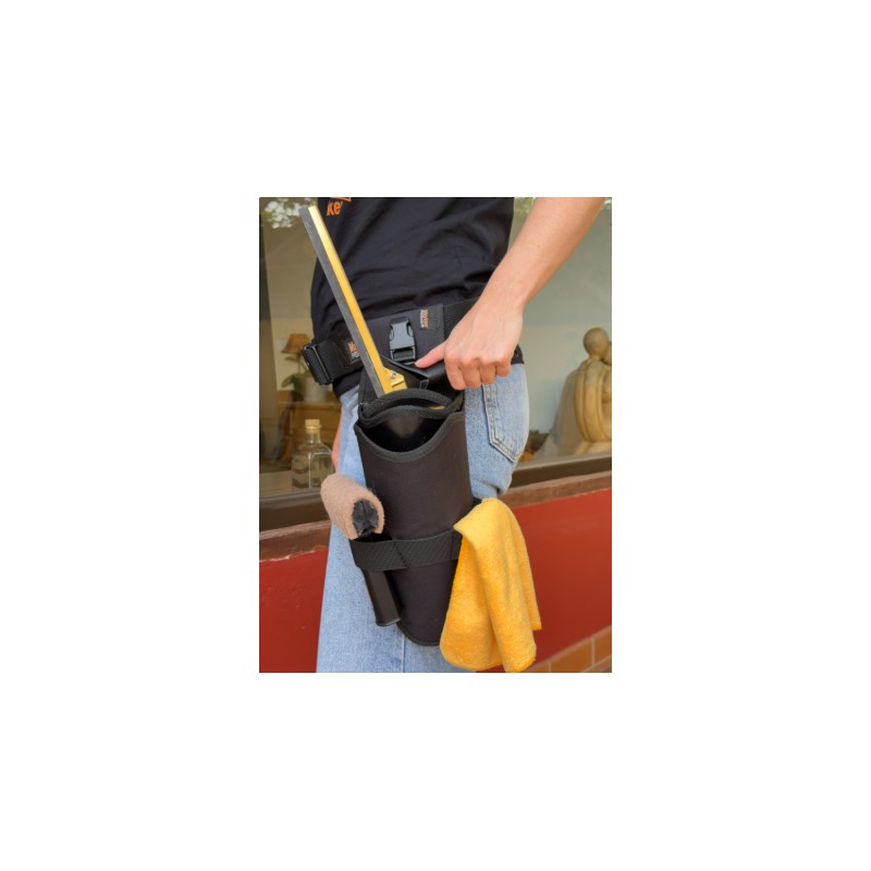 The Grackle features a flat back surface that lays comfortably on your leg while providing enough room for your most essential tools. The front and middle sections can hold separate squeegees and stripwashers, or two-in-one tools up to 45 cm in length. The front pocket holds your squeegee, while the middle pocket is designed to cradle your mop and keep it wet. This will save you time, money, and your back, as you won't need to bend down and reach your mop into a bucket throughout your workflow.