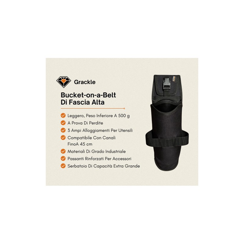 Questo bucket on a belt (BOAB), ovvero fodero per attrezzi, di fascia alta è realizzato con materiali industriali di prima qualità per resistere agli ambienti più impegnativi della pulizia professionale dei vetri. Progettato per garantire durata, comfort ed efficienza, il Grackle è un BOAB senza funzione basculante, costruito per durare tutta la vita.